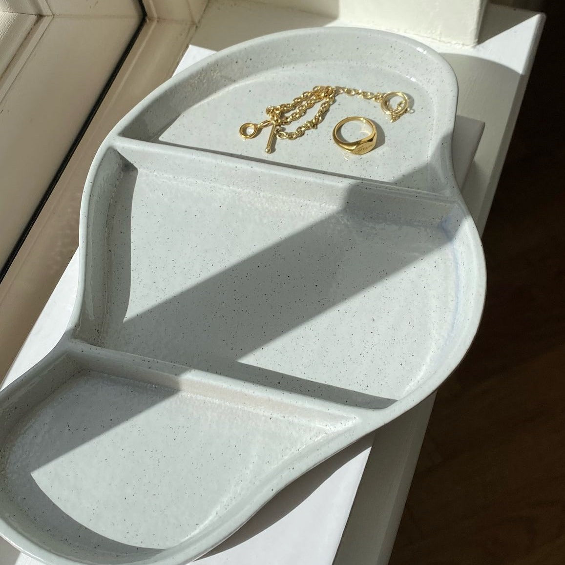 Abenna is a beautiful and practical ceramic tray divided into three compartments. This elegant tray is perfect for organising small items such as jewellery, keys, or other decorative elements. It is ideal on the desk, in the entrance area, or on the coffee table to keep your small items organised and easily accessible